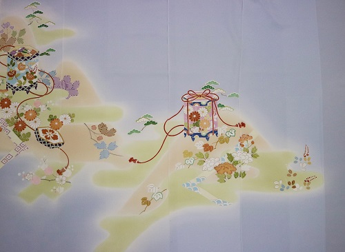 吉祥柄の貝桶を前面に配置した、古典柄の附下です。菊に梅、橘、牡丹、蓮…とさまざまな吉祥紋をあしらい、附下と言えど格は訪問着クラスです。控えめな柄付けなので重くなりすぎず、ご親戚の結婚式など一歩引いた場に最適。単衣で仕立てていただいてもよいでしょう。薄ブルーのほか、ベージュ・ピンク地をご用意しております。