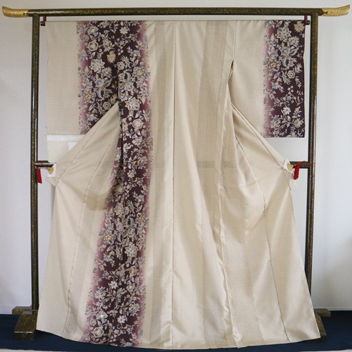 ゴールデンシルクと呼ばれるインドネシアの野蚕、クリキュラの生地に更紗文様を絵羽付けで染めた訪問着です。さらに文様部分には、ふんだんに汕頭刺繍をほどこしてゴージャスさを出した逸品です。しゃれ袋を合わせて、秋のパーティにぜひお召しください。