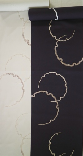 紋意匠紋シボの生地に、定番の雪輪を染めました。疋田染めで表現した雪輪は濃淡ボカシを入れており、表情に変化をつけています。小紋として仕立て、お好きな名古屋帯と合わせてカジュアルなお出かけを楽しむのも素敵ですし、羽織にすれば比較的お若い方も使いやすい一枚になるのではと思っています。