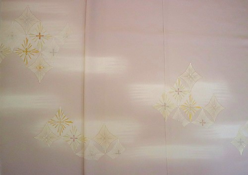 やわらかな薄桜色の駒無地に、おめでたい松菱柄を七宝取りで染めました。ポイントに色糸で刺繍を入れて重みを出しておりますので、初釜をはじめ年始のおめでたい席にぴったりのきものです。はんなりとした正統派な柄ですので、格が必要なシーンの強い味方となる一枚です。