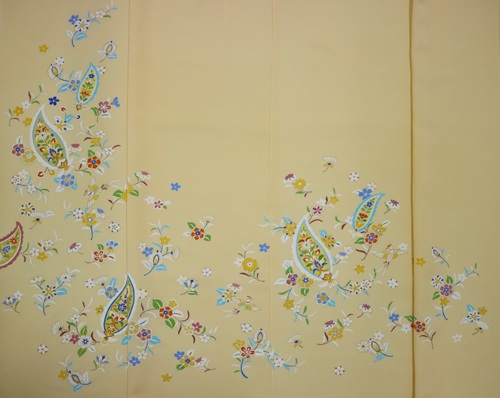 ぱっと周囲を照らすような鳥の子色の駒無地に、花食い鳥をポイントに置いた附下です。ペイズリー柄のような正倉院華文をキレイ目な配色で描き、お若い方にも着ていただける一枚に仕上げました。訪問着にできるくらいの華やかさの質量がありますので、袋帯も明るめな雰囲気のものを合わせていただくとすてきです。