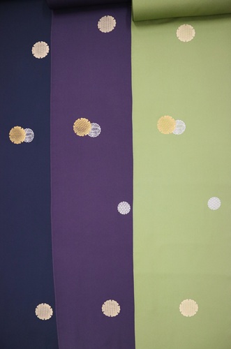 金銀の摺箔で雪輪柄を描き出した小紋です。以前もお作りがございましたが、今回は紫、濃紺、梅幸茶色の渋好みの色目をラインナップ。落ち着いた大人の女性の雰囲気を作り上げてくれる小紋です。塩瀬帯を合わせると粋な雰囲気にもなりますよ。