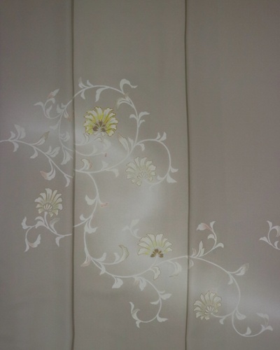 灰桜の駒無地に、白揚げで正倉院唐草を描いた附下です。落ち着いた色合いなので、入学・卒業式で来ていただいたのちも、ちょっとしたパーティシーンで長く活躍する一枚です。礼装用の帯の中でも華やかなもの、シンプルなものと替えることで印象ががらりと変えられるのも楽しいところ。他に水色地と白茶色のご用意もございますので、お気に召したものをお選びください。